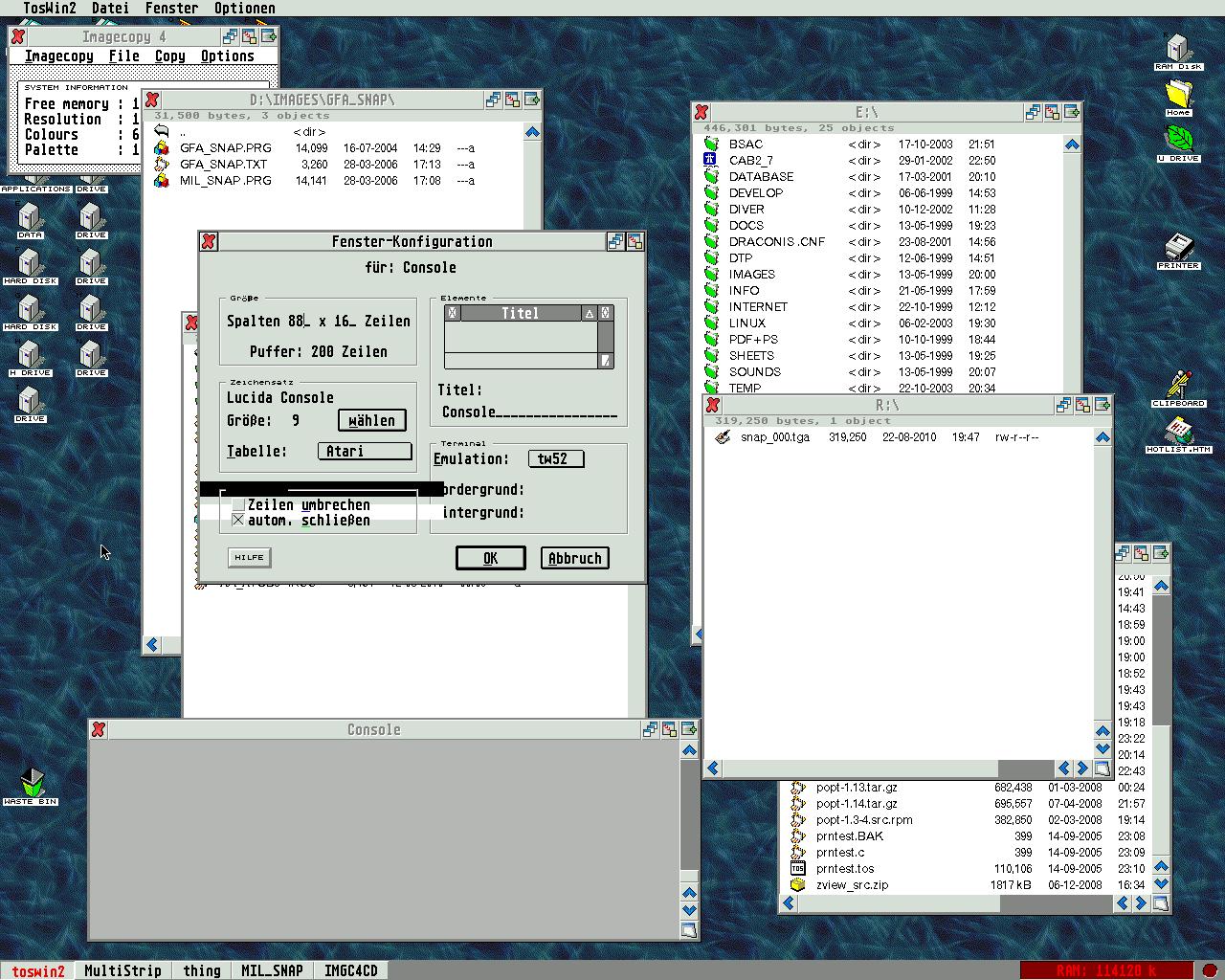 On Sun, 22 Aug 2010 20:35:31 , Vincent Rivière <vincent.riviere@freesbee.fr> wrote: > Miro Kropacek wrote: > > How did you reproduce it? I have all libs installed, I run new toswin2 > > + english rsc in any setup and I still see correct color picker. Did > > you use textures or gradients? > > I use my more or less standard EasyMiNT setup. > I have updated all the mint folder to 1-17-0, but I have kept my > original cnf files. > I have backuped my old toswin folder, and installed the one provided in > the daily trunk. I have kept the german RSC provided with the trunk > (this may be a significant difference). > > About texturing, I don't know where it comes from. > I have textures in the background of menus, as well in the title bar and > the sliders. > I have just turned off the texturing by renaming the Xaaes IMG folder and rebooting. The dialogue box is still being mangled by the black and white stripes. They seem to vary depending on where the dialogue is positioned. Peter
